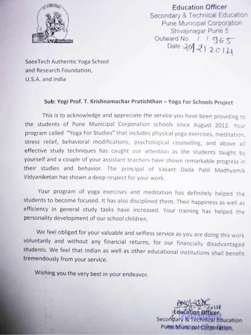 Dear Mr. Kulkarni, Thank you so much for your gracious service throughout the year. It was very nice of you to volunteer your services w/o expecting anything in return. I have learnt a lot this year about Yoga and I am grateful to you for this. My concentration and mental health have also improved, thanks to you. I am very grateful, and I hope to see you again. keep having a happy face. From, A Student, TJ.