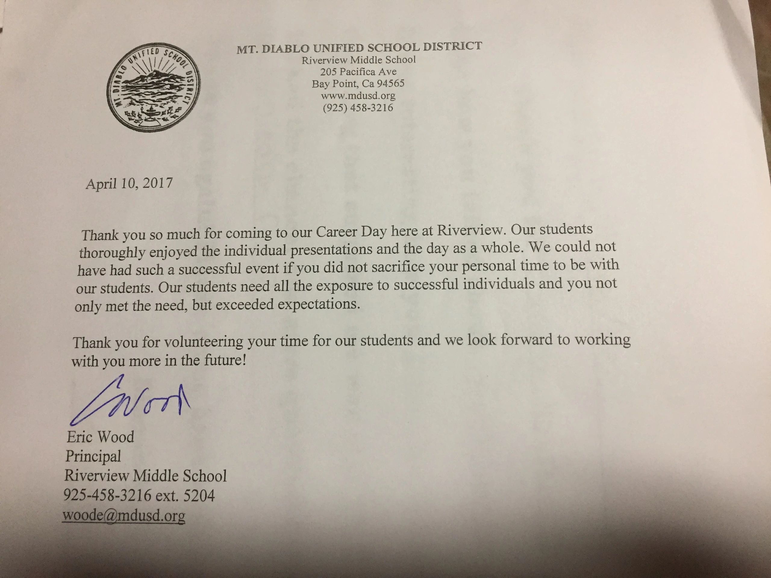 This letter is an acknowledgement of the three classes that Neel Kulkarni taught in May 2018 to three classes of 6th grade students at Riverview Middle School in Bay Point California. Each of the three classes had at least 50 students, both male and female, aged 11 and 12 years old. These students attended Riverview Middle School which is in a low economic area, has a multiethnic population and has many students who are English language learners. Some of these students also had specific learning disabilities, ADHD and emotional/behavioral issues which made it difficult for them to focus and learn. Neel took complete command of each class of students as he taught them yoga, mindfulness and meditation. The students were focused and on task as Neel taught each 40 minute class. The students practiced asana, breath work, mindfulness activities and shared meditation at the end of the class. It was a pleasure and a joy to watch Neel teach and connect with these challenging students. The principal commented that he never saw these students so peaceful before.